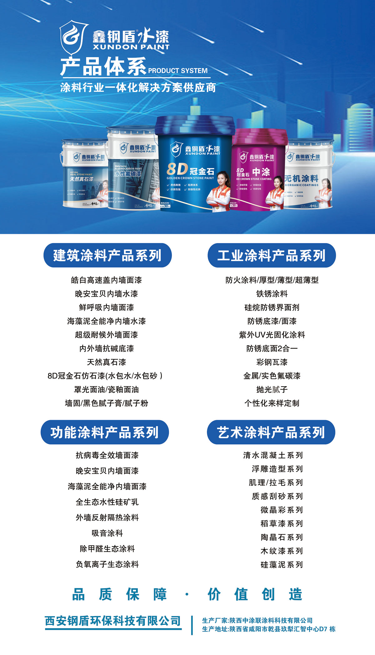 公司產(chǎn)品涵蓋內(nèi)外墻乳膠漆、真石漆、質(zhì)感涂料、多彩仿石漆、氟碳漆、防火涂料、防銹漆、無機涂料、藝術涂料等,是西北地區(qū)享有盛名的全品類涂料生產(chǎn)基地。